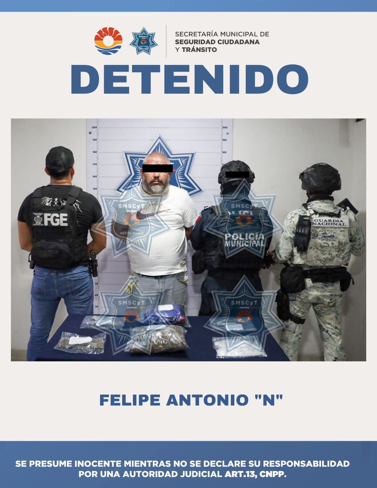 Cancún, Q. Roo., a 05 de septiembre de 2025.- Como parte del operativo “Blindaje Cancún”, elementos de la Secretaría Municipal de Seguridad Ciudadana y Tránsito (SMSCyT) de Benito Juárez, en acción coordinada con Guardia Nacional y Fiscalía General del Estado (FGE), detuvieron a un hombre señalado como presunto responsable de delitos contra la salud.