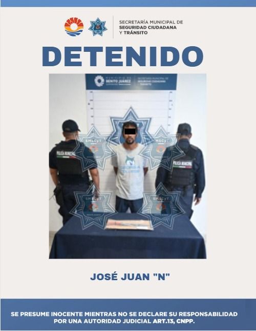 Cancún, Q. Roo, a 23 de agosto de 2025.– Elementos de la Secretaría Municipal de Seguridad Ciudadana y Tránsito (SMSCyT) de Benito Juárez detuvieron a José Juan “N”, de 40 años de edad, por su presunta responsabilidad en el delito de portación de arma prohibida.